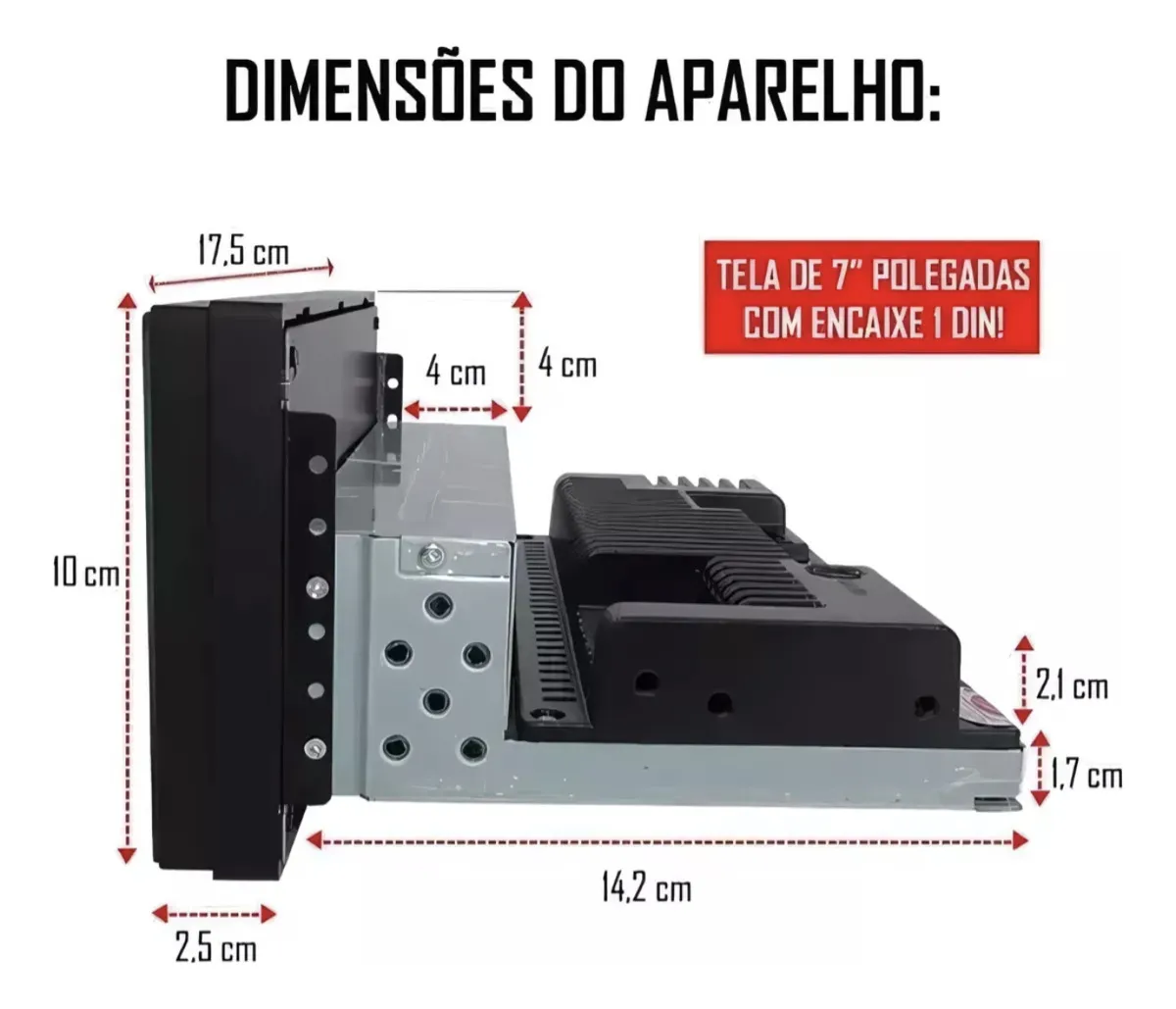 Multimidia H Tech padrão 1din com tela de 7 polegadas, Sistema Android com Processador Quadcore 2gb/32gb.